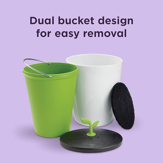 • AT HOME: Dual bucket design with removable inner bucket and built in handle allows food scraps to easily slide out without a mess or hassle.