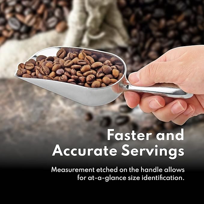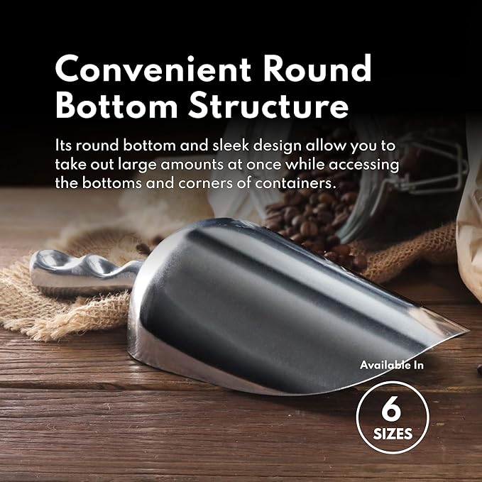 • One-piece aluminum construction, this scoop is a durable alternative to plastic scoops that are prone to breakage.
