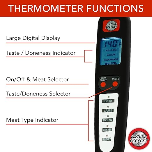 • DO YOU WANT TO BE A GRILLMASTER? The Grille Perfect thermometer has all the settings you need to ensure perfectly grilled food every time you grill! Five meat types to choose from and four doneness level settings lets you select the perfect settings for each guest at your cookout.