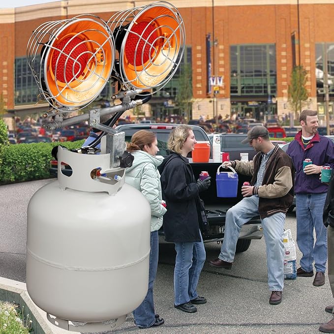 • USEFUL: Hooks up in minutes, heats up in seconds; Great portable heater for camping Propane burner heads swivel up to 45 degrees for directional heating on top of the propane tank