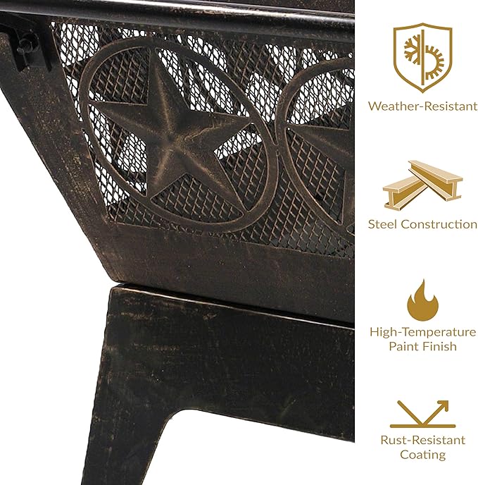 • DURABLE, WEATHER-RESISTANT CONSTRUCTION: This wood fire pit for outside is made from heavy-duty steel with a bronze, high-temperature paint finish for long-lasting performance and resistance to heat, outdoor elements, and rust.