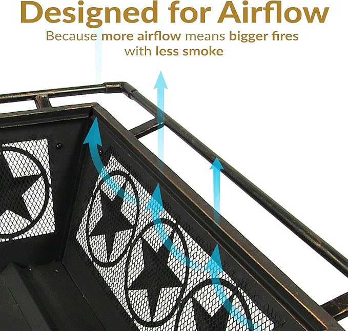 • ENHANCED AIRFLOW AND SAFETY: The mesh sides of the cooking fire pit with star cutouts and built-in wood grate improve air circulation, allowing wood to burn hotter and longer with less smoke. The included spark screen helps contain embers, while the poker allows for effortless fire control and log adjustment. The outer ring surrounding the pit adds an extra layer of security by ensuring a safe distance while tending to the fire.