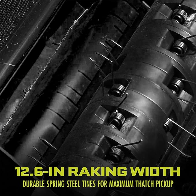 • High-Powered Performance: Equipped with a 12-amp motor, this versatile dethatcher and scarifier covers a 12.6-inch-wide path, making lawn care faster and more efficient.