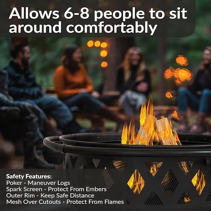 • IMPROVED AIRFLOW AND SAFETY: The outdoor fireplace for patio includes a metal spark screen and mesh-covered cutouts for added safety from flying sparks, a weather-resistant round cover, and a poker tool to safely maneuver the burning logs. The outer ring also ensures that everyone remains a safe distance from the flames. The fire pit features a wood-burning grate and cutouts for better airflow. This allows the fire to burn steadier for long-lasting fires with less smoke and more heat.