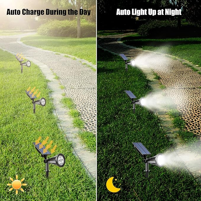 • 【Intelligent Pattern】 -- The Solar Spotlights has 2 modes--The High Light Mode will Last for 8-10hrs after Fully Charged. The Low Light Mode will Work for 14-18hrs after Fully Charged. What's More, T-SUN Solar Lights has an Automated Switch-Auto on at Night/Auto off at Sunrise.