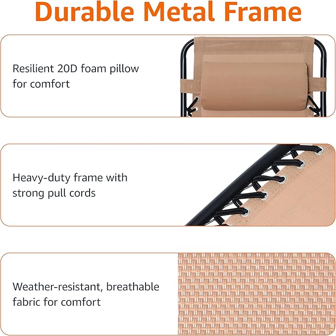 Amazon Basics Outdoor Patio Zero Gravity Lounge Chair with Pillow, Folding Reclining and Textilene Adjustable, Folding Lounge Lawn Chairs for Outside, 26", Beige