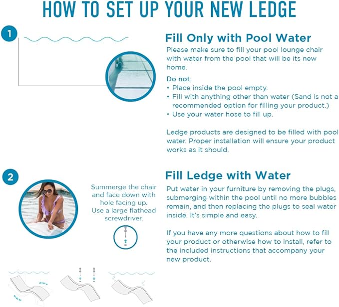 • MINIMAL ASSEMBLY - Fill completely with water to avoid buoyancy in your pool by fully submerging and rotating in the water. Tilt the chaise as you place on your ledge to remove any bubbles or pockets of air away from the feet. Lay back and enjoy your own personal oasis.