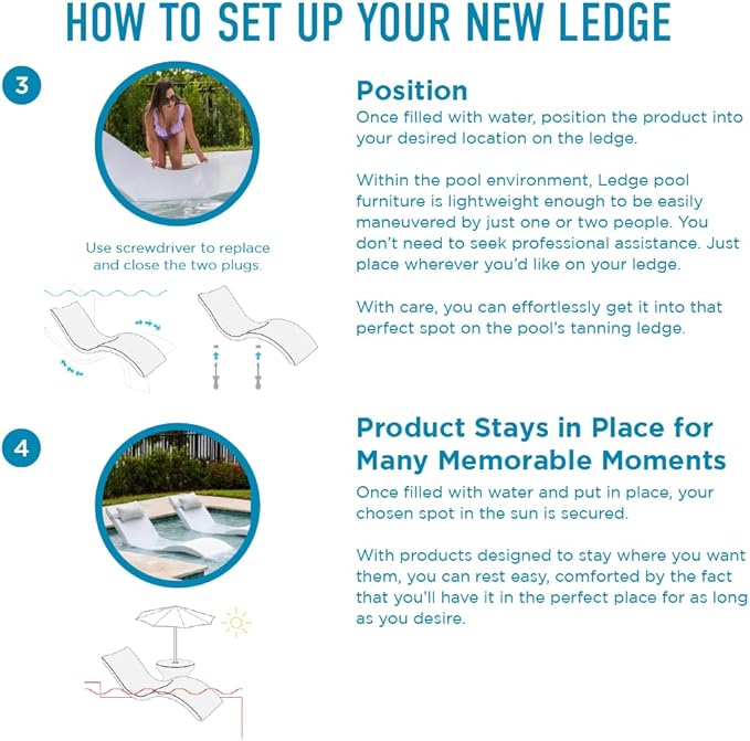 • MINIMAL ASSEMBLY - Fill completely with water to avoid buoyancy in your pool by fully submerging and rotating in the water. Tilt the chaise as you place on your ledge to remove any bubbles or pockets of air away from the feet. Lay back and enjoy your own personal oasis.