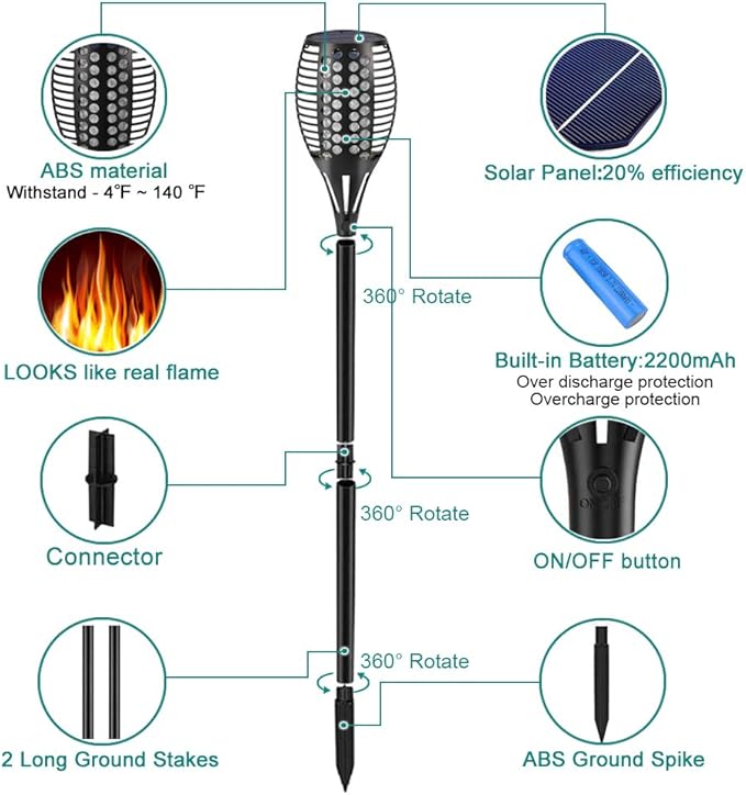 • 🔥AMAZING FLICKERING FLAMES SOLAR LIGHTS : This solar flame torch light is a safe alternative to the real “flames”. 96 LEDs in the light cast a safe, soft, mood-enhancing glow,provide a perfect campfire atmosphere for your patio, backyard, deck decor ,garden,party, BBQ and camping.