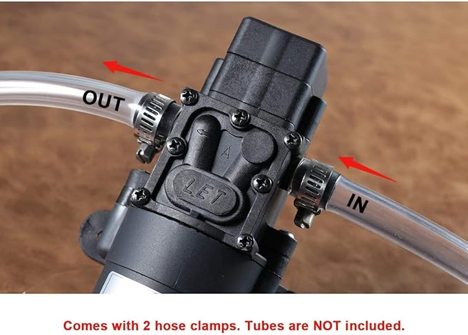 • Inlet and Outlet: 3/8-inch hose barb ports. Vertical Suction Lift: 6.6ft (2m). CUT-OFF Pressure: Default 80-85PSI. It doesn't mean 4.5L/min jet at 100PSI. Comes with 2 tube clamps. WARNINGS: DC 12V Power supply ONLY!! No AC power. Voltage OVER 14V can burn the motor.