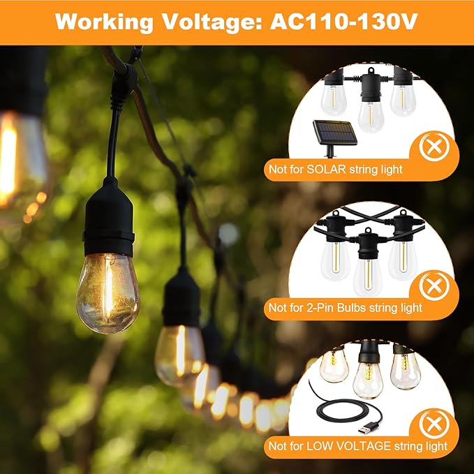 • ⚠️ Warm Tips: WORKING VOLTAGE: 110V-130V, these S14 light bulbs are not compatible with SOLAR STRING LIGHTS or other string lights that operate at a LOW VOLTAGE(such as DC 3V or 6V).