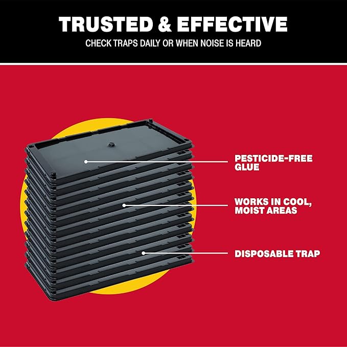 • YEAR-ROUND PROTECTION: The disposable large mouse pad is sticky, pre-baited, and ready to use. Our adhesive formula is designed to prevent hardening that can limit the effectiveness of the rodent and snake trap. When placed in an area with normal conditions, glue mice traps can last up to one full year. The mouse and rat trap can be used as an alternative to glue boards that may not hold up as well in damp or humid areas like basements or bathrooms.