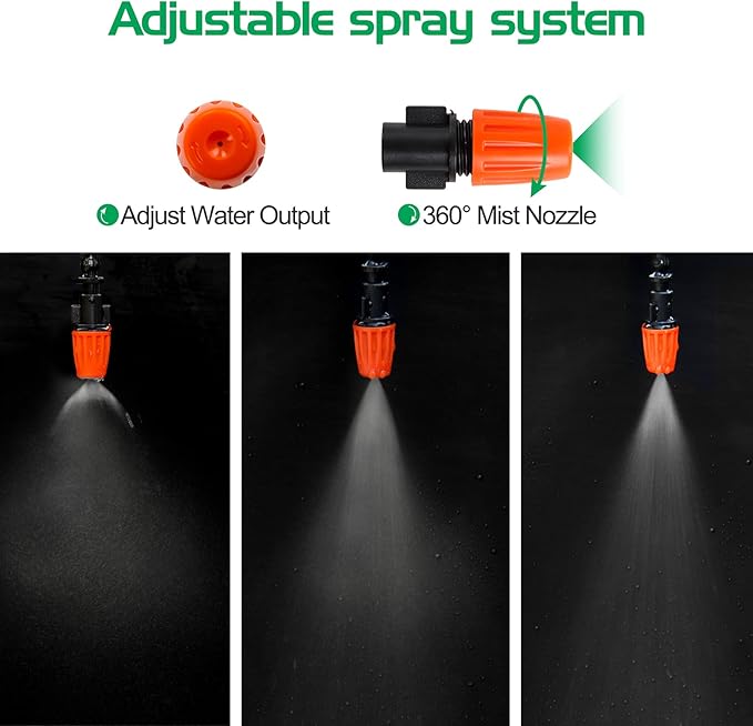 • Flow rate of each mister: 6.7-7 L/Hour, Max spray diameter: 0.3m. Up to 70 percent water savings compared to manual watering.The nozzle has two water outlet modes, columnar and misty, you can adjust the nozzle according to your needs.