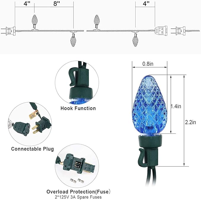 • 【Safety Guaranty】: UL listed, IP44 waterproof level, safe for Indoor and outdoor use, this LED string lights adopt overload protection (fuse), 2 replacement fuses included.