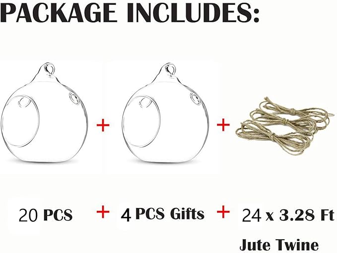 • PACKAGE INCLUDES: 20 Pcs/ Set and we offer additional 4 pcs for you in case some of them are confronted with violent transport( which is seldom incidents), so you will receive 24 pcs glass candle holder + 24 x 3.28 Ft jute twine strings. Candles are not included.