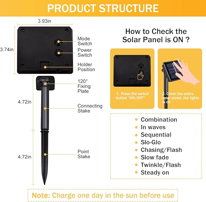• 【Energy Saving Solar Outdoor Christmas Lights】Are you still worried about finding an outlet in the outdoors? Our solar string lights can help you solve this problem! No socket, energy saving, and environmental protection, only need sunlight to work! Super large capacity, fully charged can operate for more than 8 hours! *NOTE: Before use, please turn on the switch, tear off the protective film on the solar panel, and make sure the panel is facing the sun