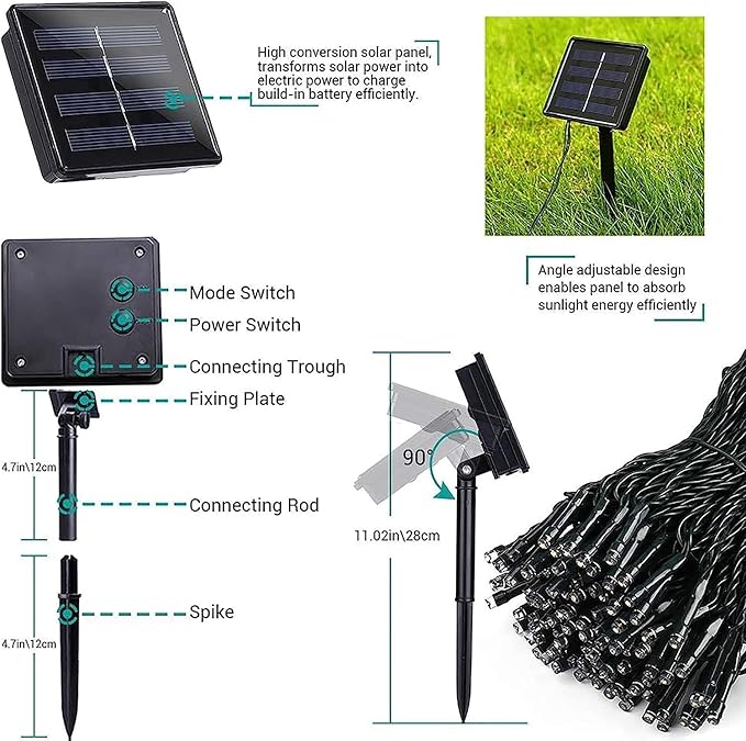 • Easy to Install and Operation - Solar panel with ground stake, 72ft long string is perfect for wrapping around a tree or wherever you like to light up your garden, patio, lawn, porch, gate, yard, fence, balcony, etc. The wire between the first LED light and the solar panel (lead cable) is around 6.5 ft, so you can put the panel in a suitable place.