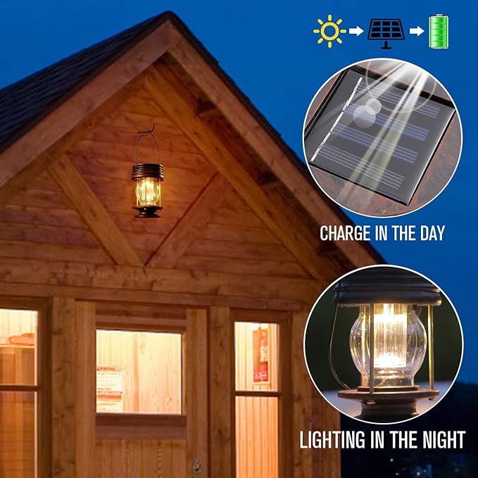 • 【Waterproof Design】-- The solar lanterns are made of high-impact ABS plastic proven to withstand in bad weather.IP44 waterproof grade, no more worries about raining, snowing, perfect for outdoor use.