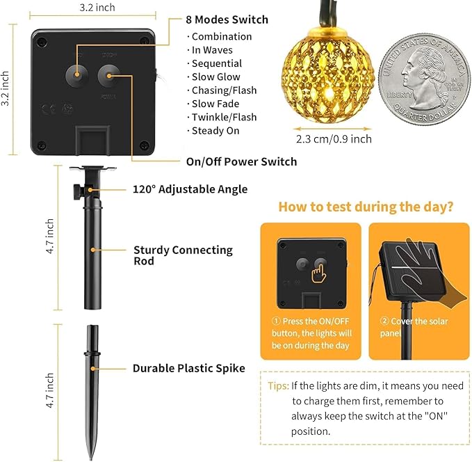 • 【Wide Application & Memory Function】The solar globe string lights with built-in memory chip save your last modes setting and no need to reset mode every day; Perfect decoration for terrace, pergola, bistro, backyard, deck, patio, garden, Christmas, holiday, wedding, party and other celebration occasions.