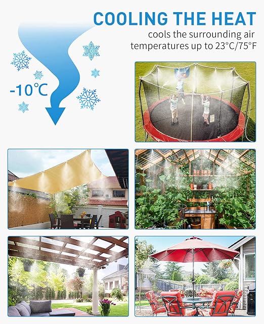 • Cooling the Heat: Misting cooling system keeps cooling down outdoor areas such as backyard, lawn, gazebo, canopy, deck, poolside, umbrella, etc., maintaining the surrounding temperature at 23°C/73°F