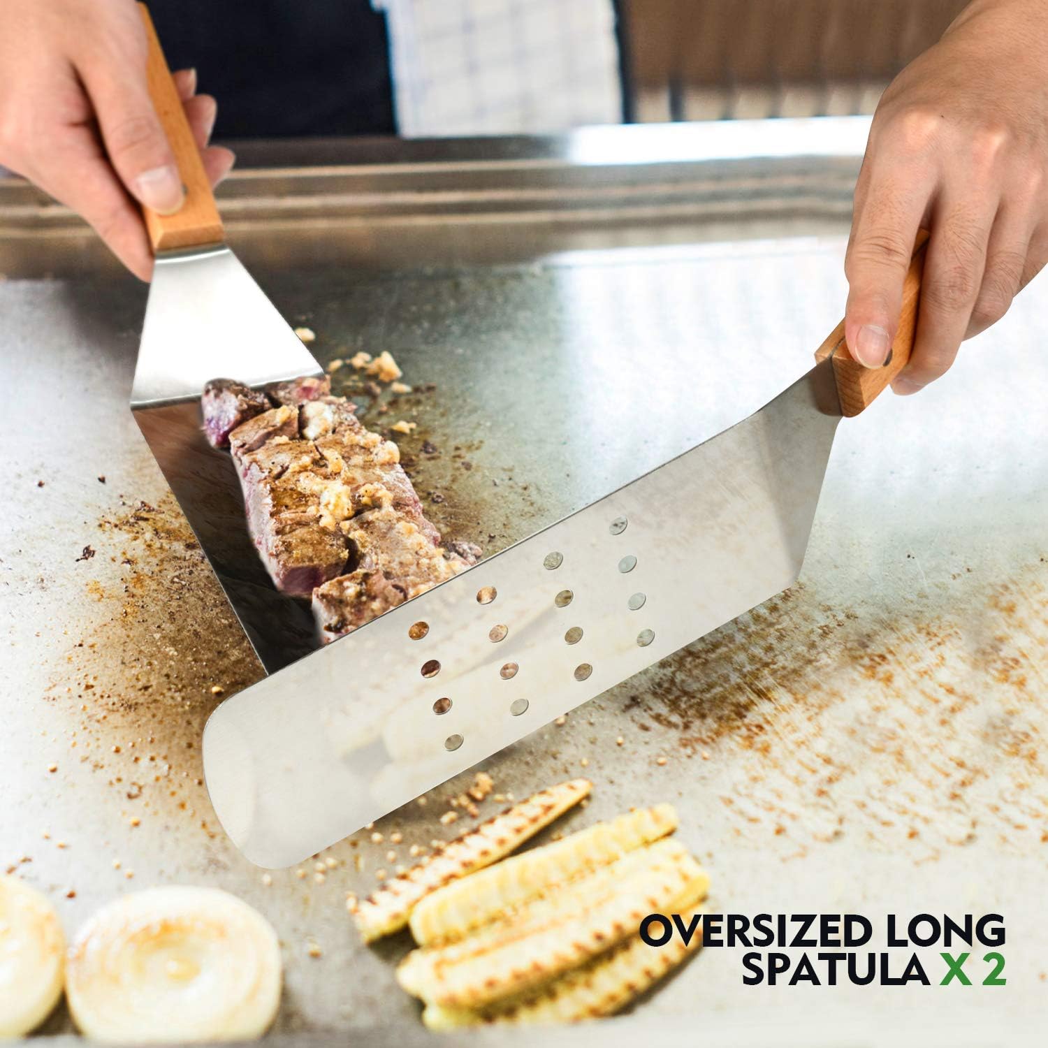 • 🔥【Multipurpose Outdoor or Kitchen Cooking Kit】2 Oversized griddle spatulas, great for flipping beef cubes, fried egg, rice, noodle and vegetables. 2 Regular size grill flippers/turners (can be use as shorter spatulas) with 3-sided bevel cutting edge, great for turning burger,pancake and cutting bread,meat and sausage.