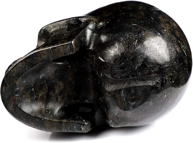 Skullis 5.0" Russian Arfvedsonite Crystal Skull, Hand Carved Gemstone Fine Art Sculpture, Reiki Healing Stone Statue.