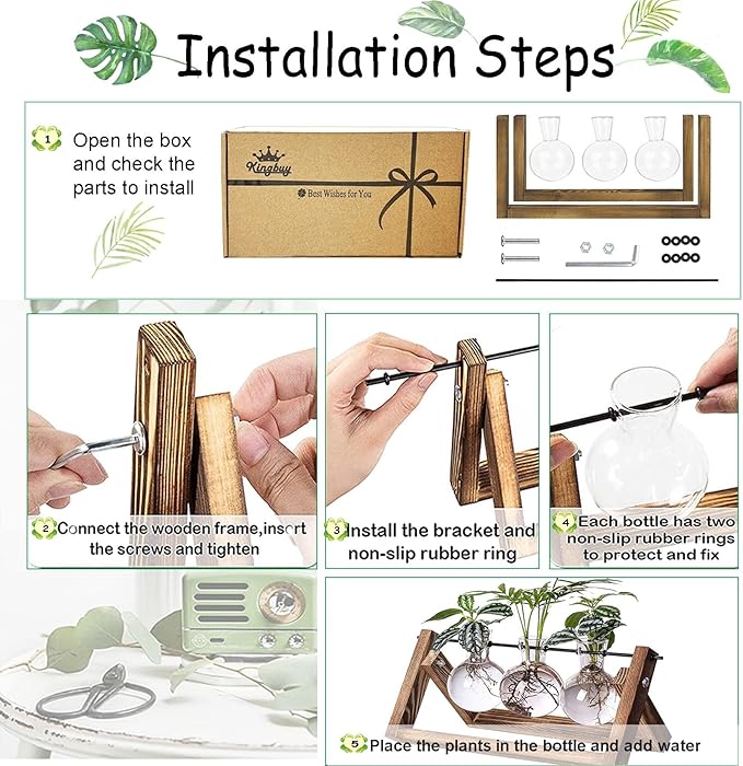 • Easy to Install: Easy to set up in 5 minutes (the hexagon screwdriver and screws are included). Just remove the glass vase or rotate it to pour the water, which is convenient for daily use and clean. No plants or props included in this item!