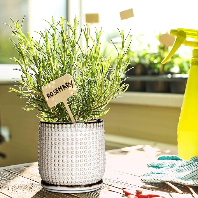 D'vine Dev 6 Inch Ceramic Beaded Stoneware Planter Pot - Flower Pot with Drainage Holes and Saucers for Indoor Succulent Plants or Flowers, Smoked White, 27-C-X-1