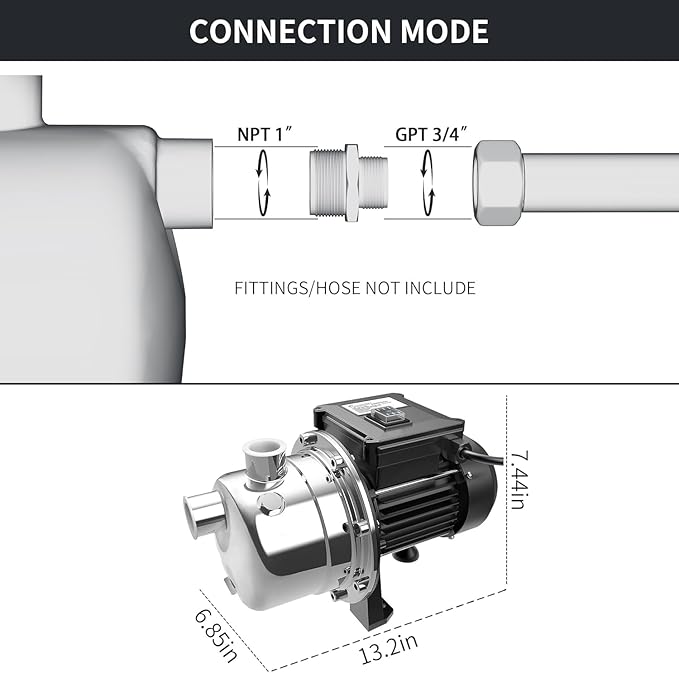 • 【Strong and Reliable Performance】The shallow well pump with 1/2 HP motor. Maximum flow rate up to 960 GPH and Max lift water up to 125 feet. Corrosion-resistant stainless steel construction extends product life and is easy to clean