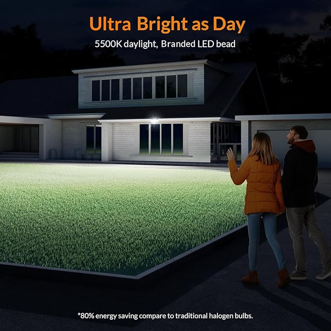 • 38 W Brightness and Energy Saving: The motion sensor outdoor light with output 38 W, 4200 Lumens, 5500 K brightness; With optical designed filter lens, it provides better illumination; Save more than 80% electricity bill compared with equivalent traditional lights 175 W