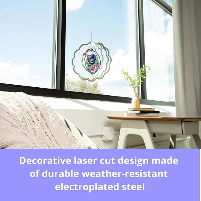 • Durable and Mesmerizing: Crafted from sturdy, weather-resistant electroplated steel metal and adorned with a decorative laser-cut design, this wind spinner showcases mesmerizing patterns that captivate all who see it.