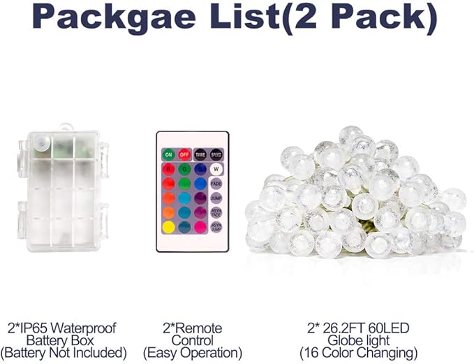 • 【Battery powered&Remote Control】It’s Requires 3 AA batteries (not included) , Each set includes a small IP65 waterproof battery case with around button to adjust the LED Crystal Ball Outdoor String Lights mode. Portable and convenient to take away for any usage. You also can do the Remote Control via the controller for the 16 color changing and 4 dynamic multi-color modes ( Fade / Jump / ASYN Fade / ASYN Jump ) to create a amazing colorful, joyful, romantic atmospheres.