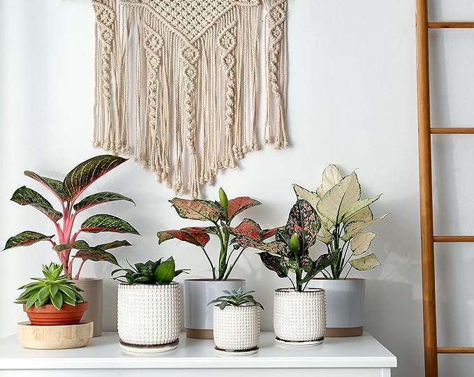 D'vine Dev 4 Inch Ceramic Beaded Stoneware Planter Pot - Flower Pot with Drainage Holes and Saucers for Indoor Succulent Plants or Flowers, Smoked White, 27-C-Z-1