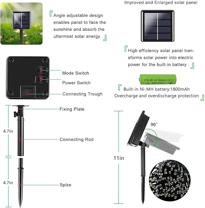 • Built-in 1800MAH Super Larger Capacity Battery and Bigger Size Solar Panel: This solar string lights upgraded battery 1200MAH to 1800MAH, so that have longer working time and more durable.