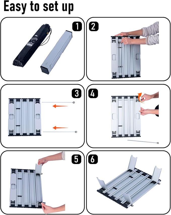 • Ultralight, made of high quality aluminum alloy 6063, only 1.5 lbs; Max Load 66 lbs; Unlike wooden or nylon-top tables, this table is durable, waterproof, corrosion-resistant, easy to clean; Heat resistant, can put your stove on