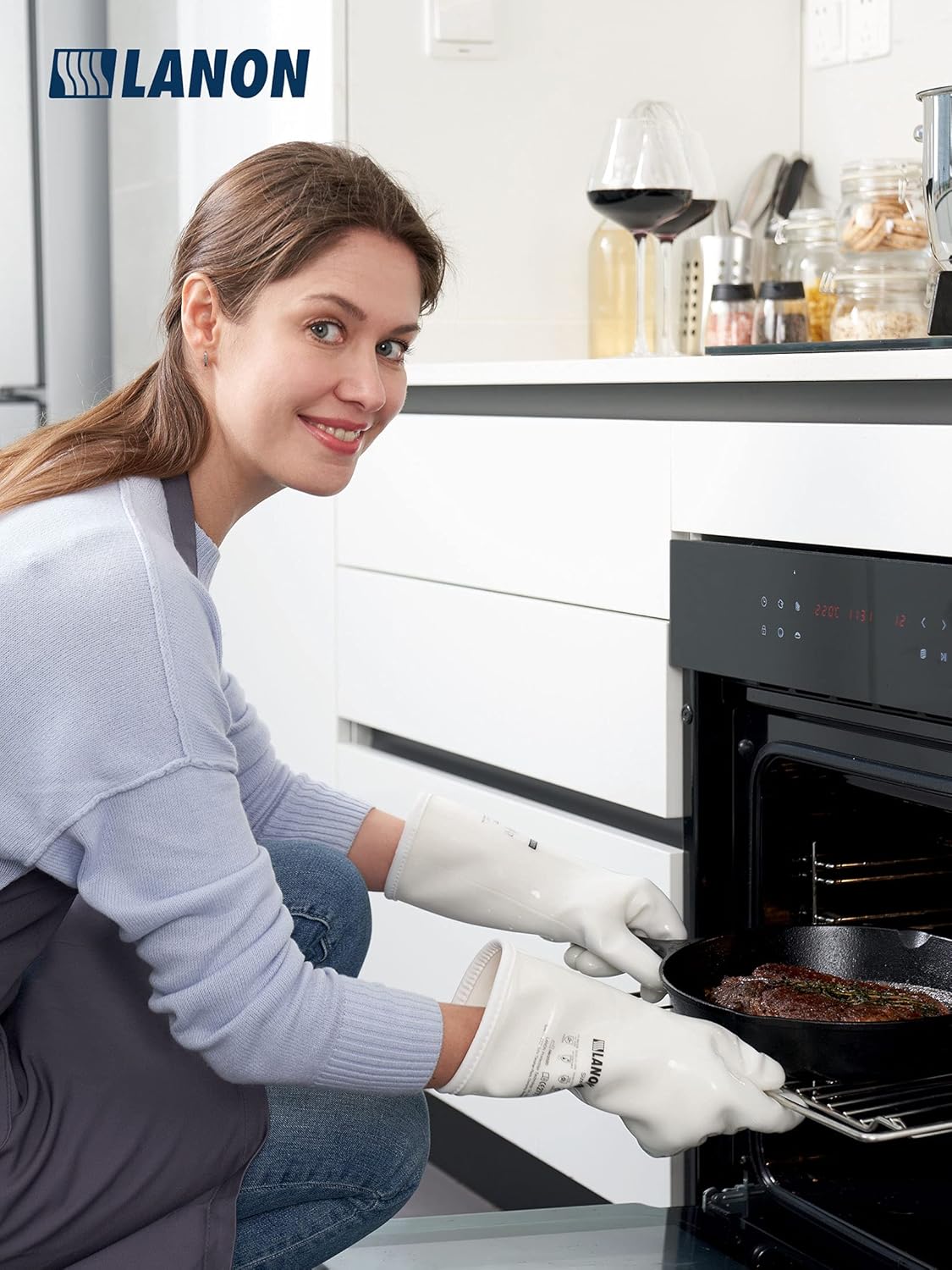 • Food grade liquid silicone - LANON is the first company to produce liquid silicone oven gloves. Our gloves are manufactured of temperature-resistant liquid silicone, an advanced material that possesses high tensile strength, stands up to daily use, and maintains its performance day after day.