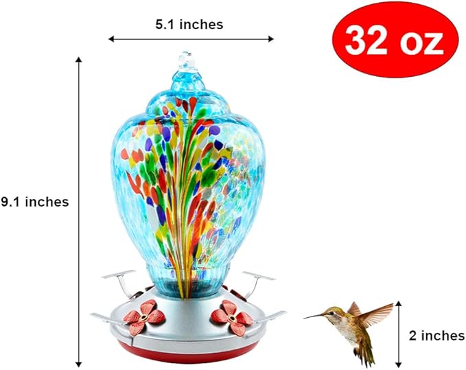 WOSIBO Hummingbird Feeder for Outdoors Patio Large 32 Ounces Colorful Hand Blown Glass Hummingbird Feeder with Ant Moat Hanging Hook, Rope, Brush and Service Card (Blue-Firework)