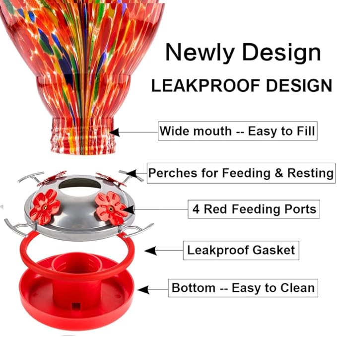 • EASY TO FILL AND CLEAN: Each Hummingbird feeder is equipped with a cleaning brush, and the clear glass, big wide-mouth reservoir, make it easy to assemble, refill nectar and clean the bottle and base