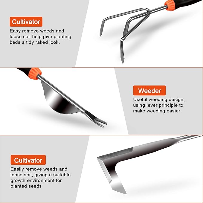 • 【Versatile Garden Accessories】 For all your household planting needs, these eight types of hand tools are extremely helpful. This stainless steel garden tool includes every detail you require, from weeding and digging up to aerating the ground and transplanting. Bringing your gardening dreams to life with the help of your natural thumb.