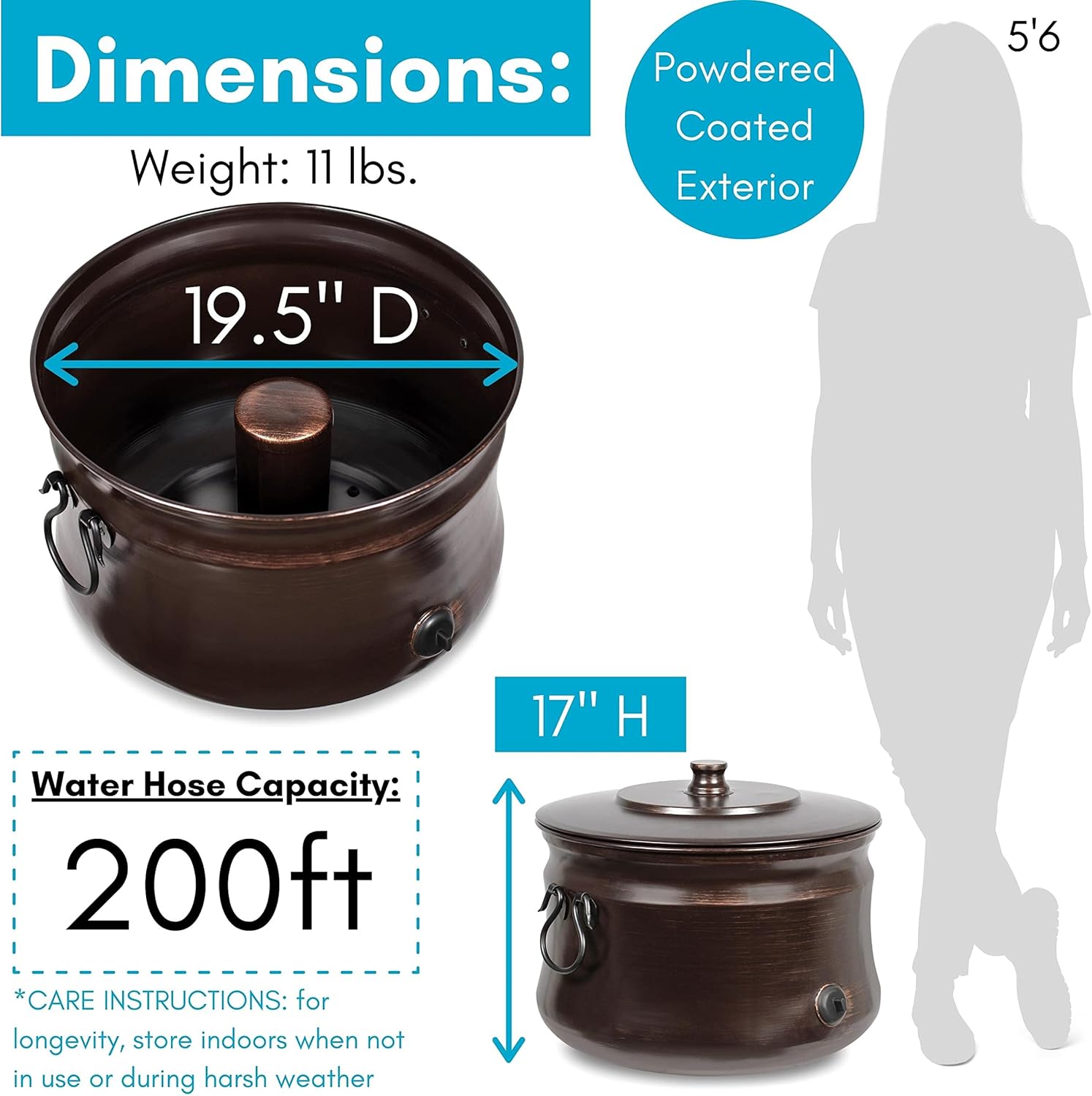 BIRDROCK HOME Water Hose Holder - Decorative Metal Pot, Indoor or Outdoor, Garden Storage Organizer, Patio Portable Bucket - Distressed Bronze, Holds up to 200ft Hoses, Large with Lid