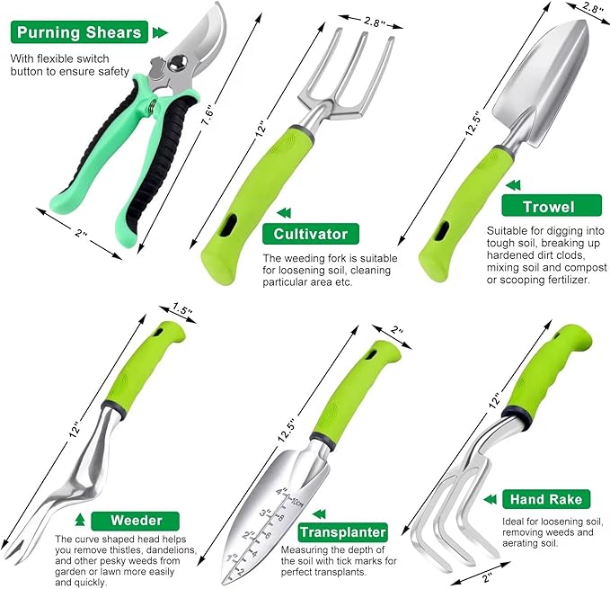 • ►High-quality and Sturdy Gardening Kit:The garden tool organizer with 6 large size metal hand tools are made of heavy-duty aluminum with Ultra-fine Polishing Technology to keep corrosion resistance and toughness. The gardening items are high hardness and no need to worry about rusting and breaking. The garden gifts handle is made of high-quality Tpr rubber with anti-slip performance and comfort to reduce hand and wrists fatigue, gardening gifts providing you with pleasure using experience.