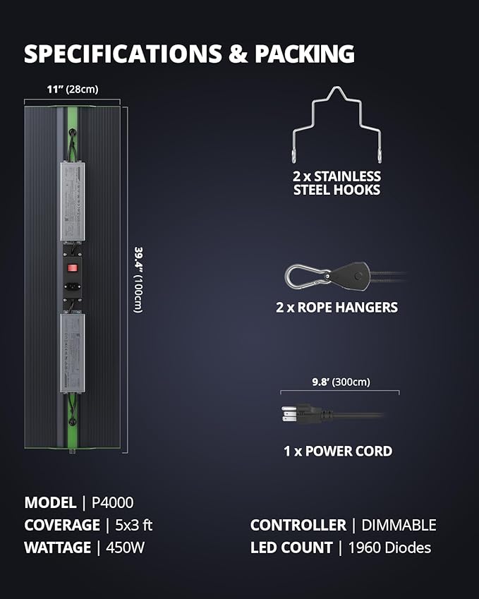 • LOWER OPERATION COST & DIMMER FUNCTION: VIPARSPECTRA P4000 LED grow light has adopted the newest SMD LED Technology to provide high PAR output, high energy efficiency and long lifespan while improving light penetration. An added dimmer knob is featured to manipulate the brightness level of the entire light, allowing flexibility to obtain perfect growth performance for each growing phase.