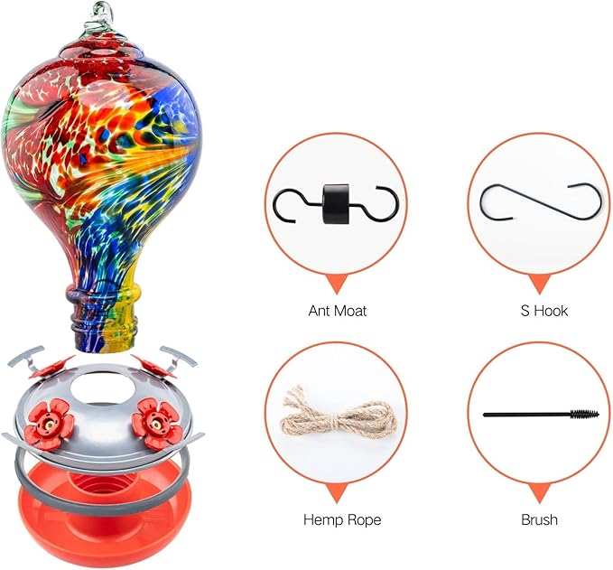 • ALL-ROUND CARE: With ant guard and bee proof metal base. Ant moat to keep unwanted visitors far away. The base is equipped with 4 perches for hummingbirds to rest. Smaller feeder ports with premium copper material designed NEVER hurt bird's tongue.
