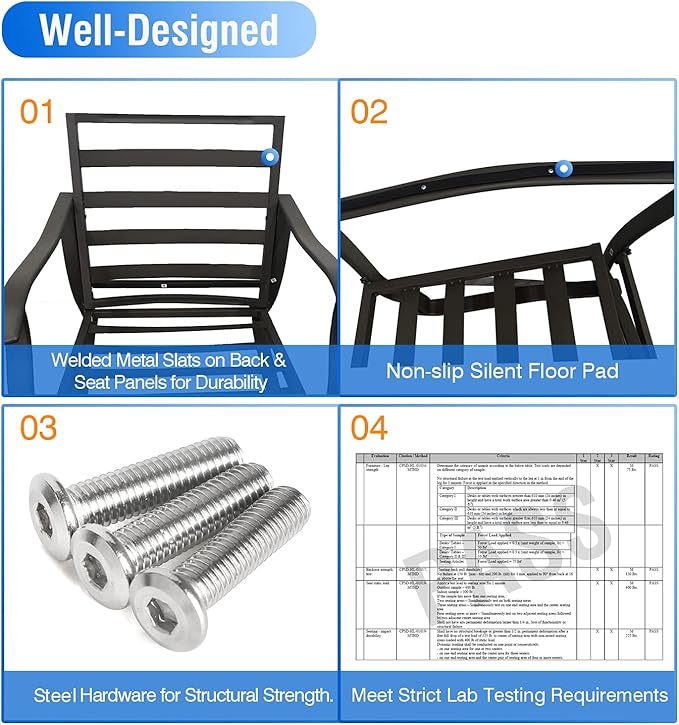 • 1.Sturdy & Durable Rocking Chair Set: Upgraded steel materials-Powder coated metal frame ; high quality spunpoly back & seat cushions; Meet strict lab testings for safety with pass result from static load capacity 400 LBS and impact load capacity 250LBS.