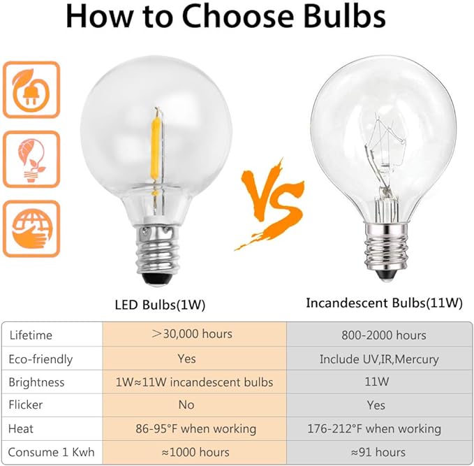• 【25FT G40 Globe String Lights】Totally with 25 sockets(E12 Base),27 plastic clear G40 Bulbs( 2 spare),Shatterproof,save over 90% energy over incandescent bulbs.The 2700K soft warm lighting is perfect for creating romantic ambience for wedding,family reunion,party and etc.