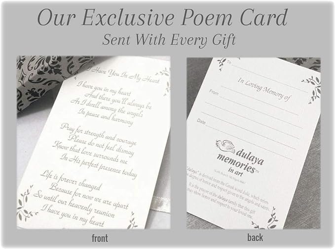 • CREATE A LASTING LOVING MEMORY: "Sending You An Angel" Poem Card Included Along With Dedication Card (see image) We know that finding the right condolences gift for loss can be challenging. We provide cost friendly sympathy gifts for loss of loved one, that’s just right to express your feelings. Includes a free condolence card. Arrives beautifully packaged for gift giving.