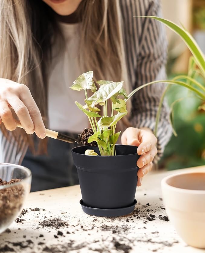 • 【Size of Planter Pots】Each plastic pot is 6 Inch in Opening Diameter, 4 Inch in Bottom Diameter, 5 Inch in Height. With a tray, these black planters are the best choice for growing indoor and outdoor small to medium-sized home/office plants.