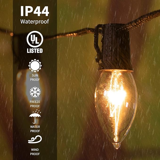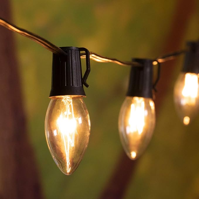 • The bulbs with (E17) socket base; each classic C9 bulb is 7 watts; one bulb goes out will not affect other bulbs; built in fuse for safety and the electrical plug contains a spare fuse; UL listed