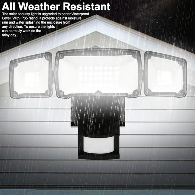 • Security & All Weather Resistant - The robust housing and impact-resistant PC lens ensures this 3 head security light fixture can stand up to the elements and bad weather. IP65 waterproof rating ensures that your 3 head security light fixture won’t give in in rain, sleet or snow weather. It's specifically designed to withstand extreme weather conditions, all weather resistant and provide additional safety and security for your home.
