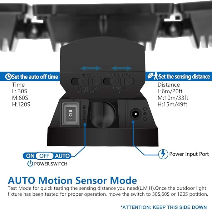 • Smart Motion Sensor - The solar light has daylight and motion sensor. The AUTO MODE (Dusk to dawn) Auto ON for pre-determined time(30S/60S/120S) when people or other living objects are detected within the sensing area, and Auto OFF after no further motion is detected. Built-in PIR motion sensor of our solar lights, it has a long range of distance and a wide angle for motion detection. Sensing range and sensitivity are both 20% higher than general solar lights, bringing ultimate using experience.